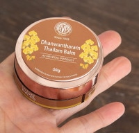 ダンワンタラムタイラム バーム(DHANWANTHARAM THAILAM)は、ごま油に約28種類の植物のパワーを溶かし込んだアーユルヴェーダの古典的な調合で、オイルの王様として知られる万能ボディマッサージオイルに蜜蝋を配合して、毎日のセルフケアに使いやすいバームにしたものです。